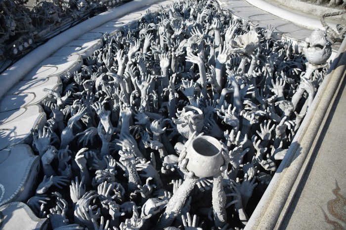 La primera impresión del Templo Blanco es sorprendente -siendo como su propio nombre indica de un blanco absoluto- y esa sensación se va acrecentando cuando vamos a cruzar el puente para entrar en el Templo Principal: apreciando a ambos lados multitud de brazos que emergen del suelo y parecen querernos arrastrar al inframundo.